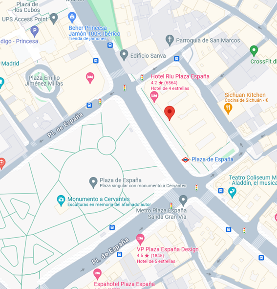 - 8:20 h puerta del hotel Riu, en Plaza de España. Calle Gran Vía, 86, Centro, 28013 Madrid. Delante de la entrada principal del Edificio España (hotel Riu Plaza de España).
