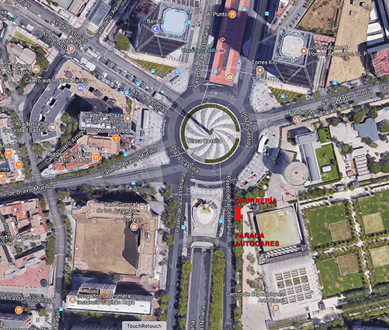 - 8:45 h Plaza de Castilla, junto a la churrería de la Castellana. Churrería Paseo de la castellana, 214, 28046 Madrid.