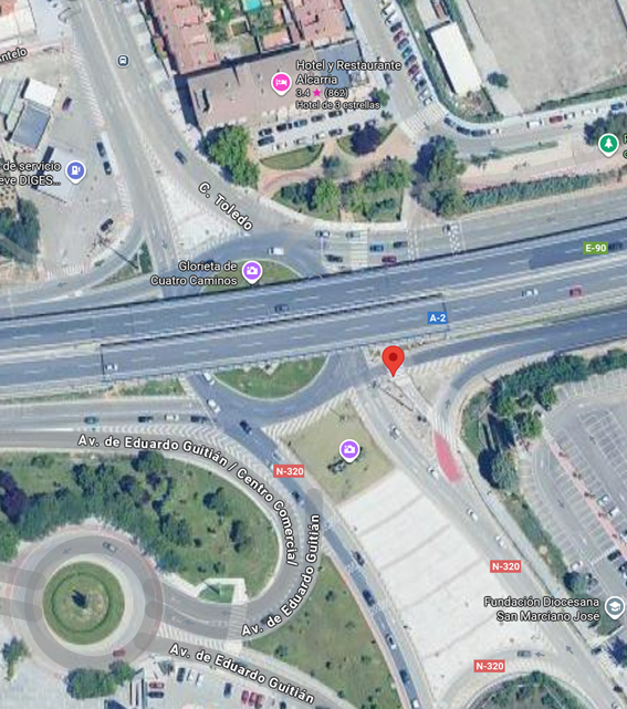- 9:30 h Glorieta de Cuatro Caminos, Guadalajara. 40°37’18.6″N 3°09’27.9″W – Google Maps. Parada rápida en el paso de peatones en dirección Zaragoza (Delante de la esquina del Colegio Diocesano).